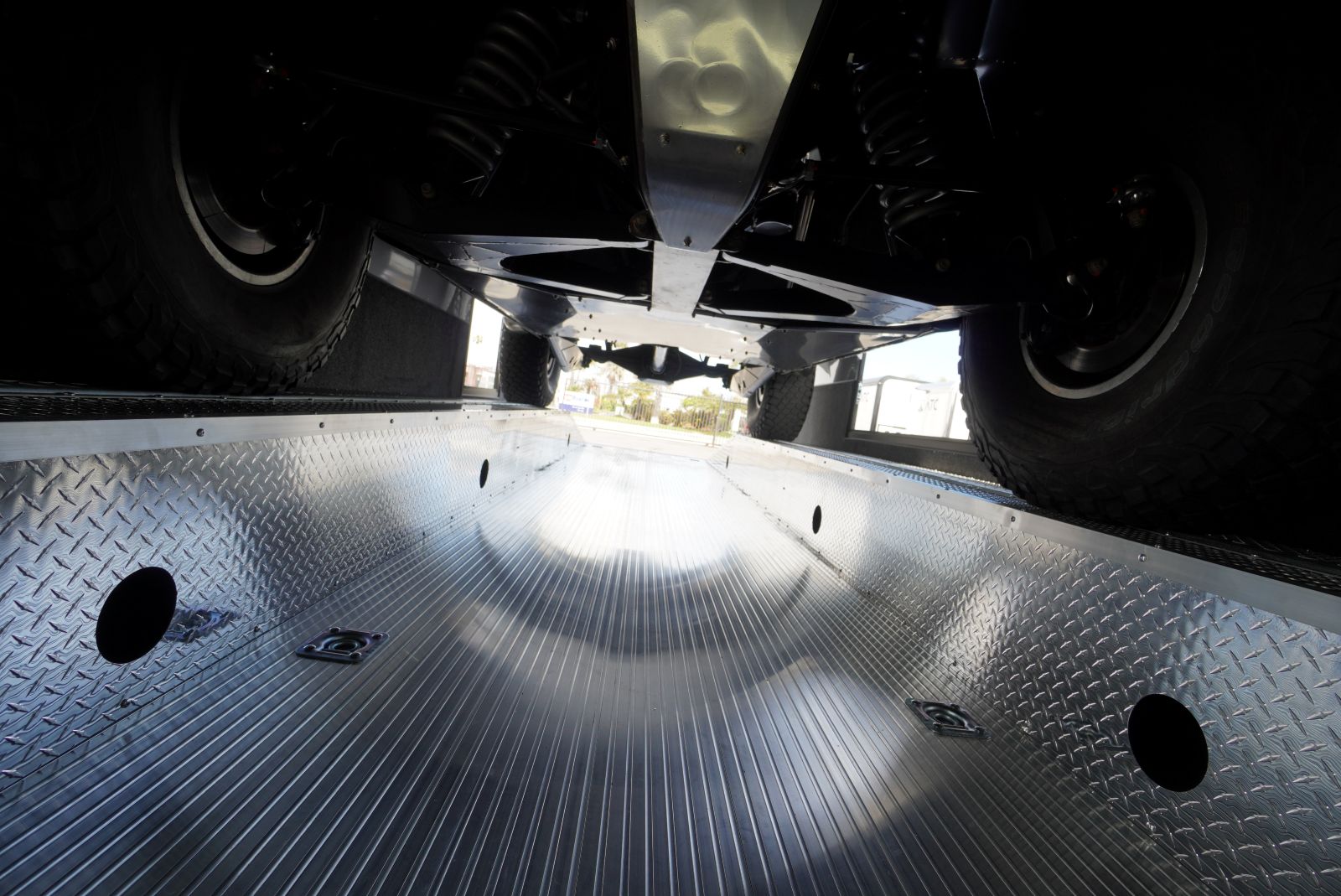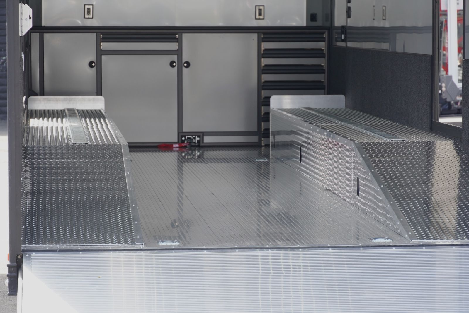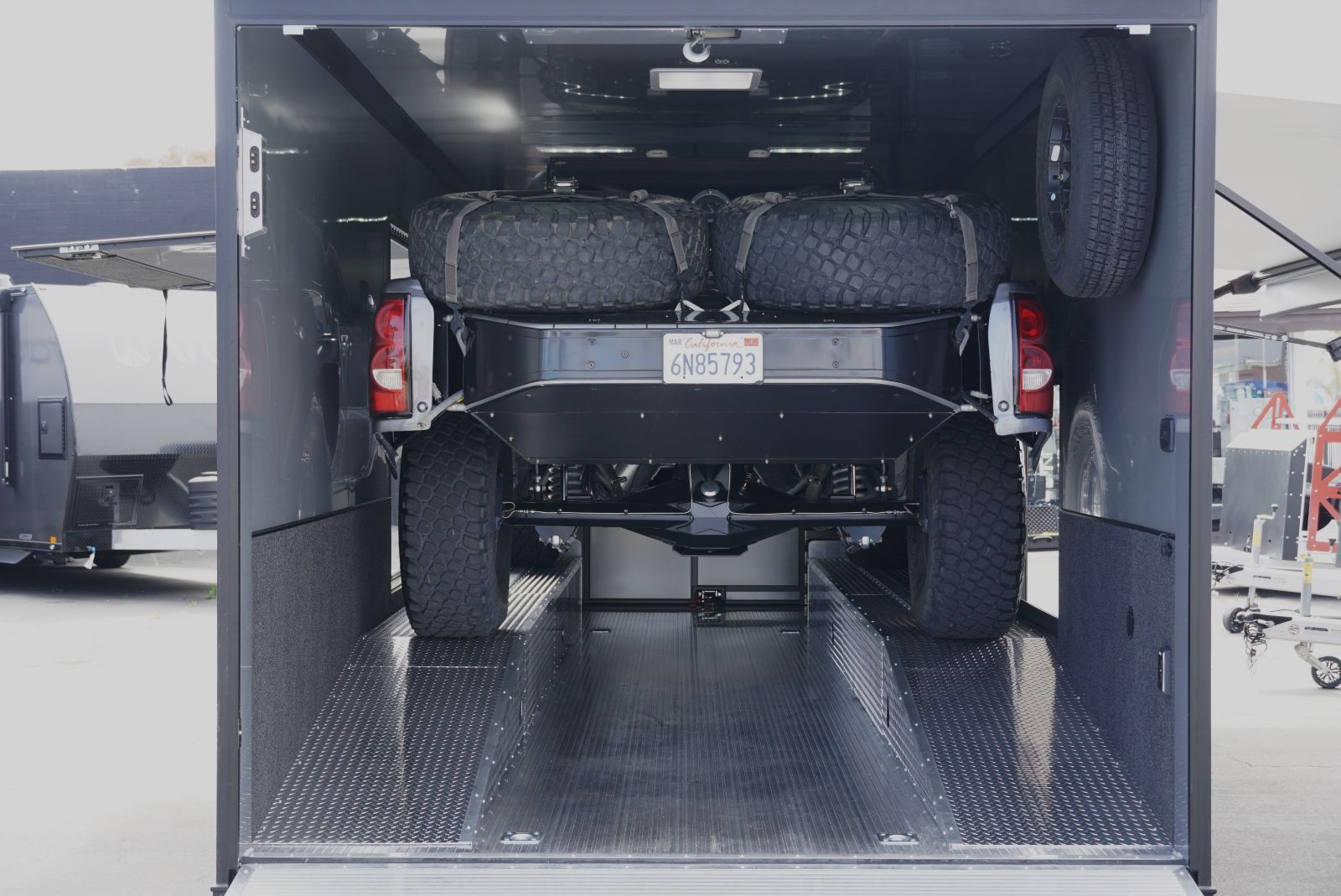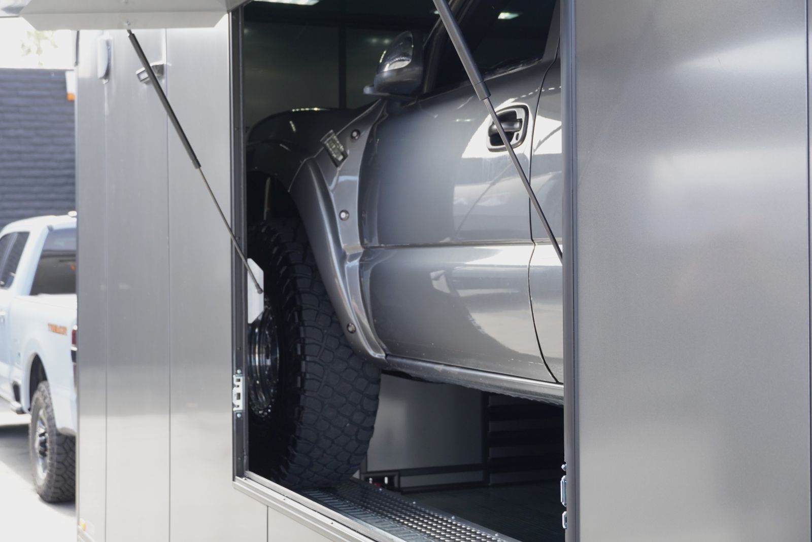 In our featured setup, we showcase a 94” wide pre-runner loading effortlessly into the trailer—no rubbing, no clearance issues, and zero compromises. The wide body kit expands the interior width, while the ramp overs provide a seamless entry angle for low-clearance or long-wheelbase vehicles, eliminating the need for wheel wells inside the trailer.