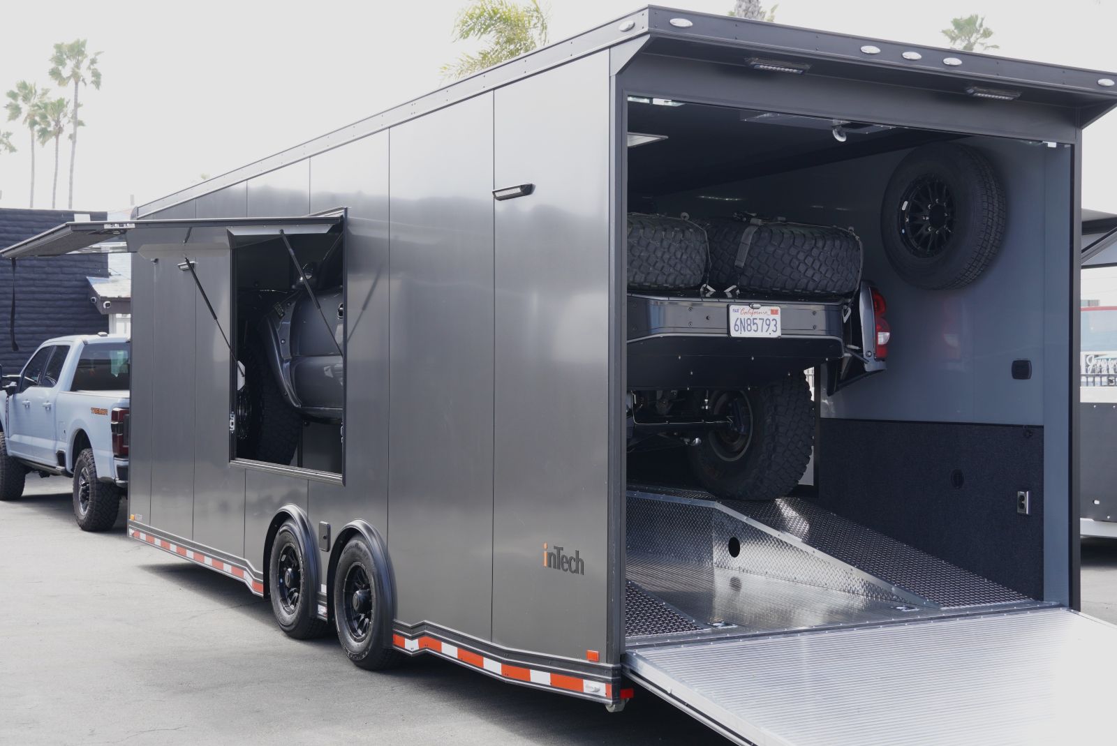 Designed for serious off-road enthusiasts, this custom Intech Aluminum Trailer features a wide body kit and integrated ramp overs, making it the perfect hauler for pre-runners, UTVs, and other wide-track off-road vehicles. Built with Intech's signature all-aluminum, fully welded cage frame, this trailer combines lightweight performance with rugged durability.